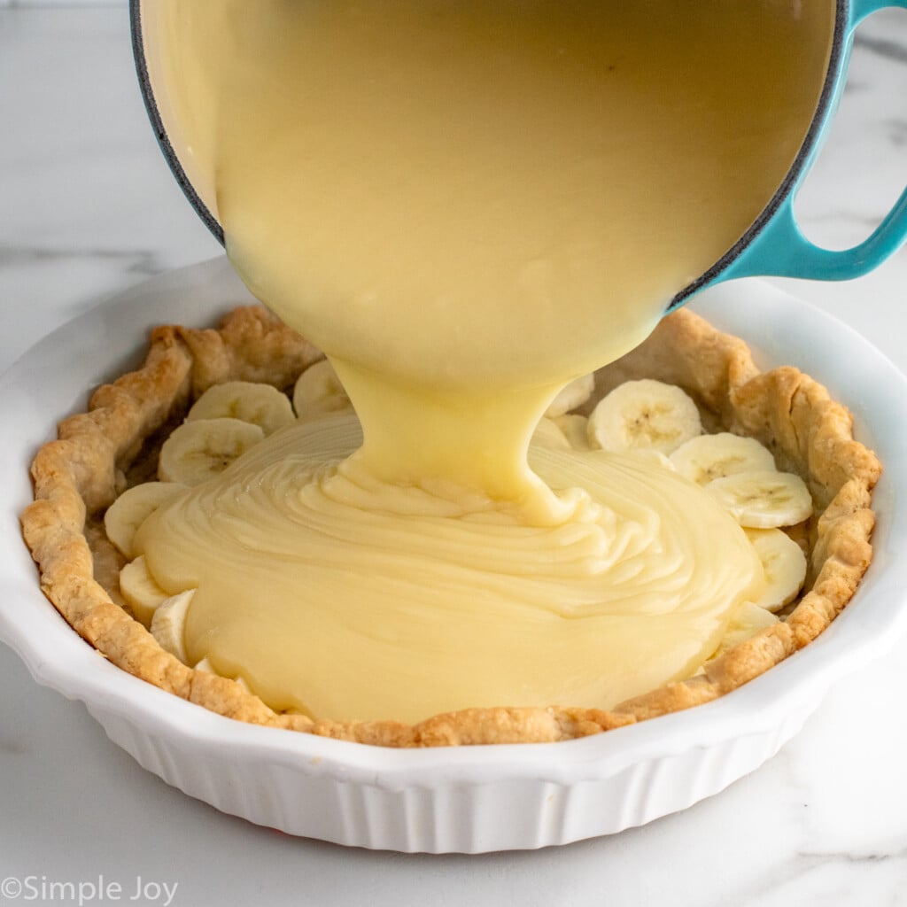 - Add the sliced banana to the bottom of the baked pie crust. Pour the pudding mixture over the bananas. Depending on the size of your bananas, you may not use all of the pudding. Put the pie in the refrigerator to cool for 4 hours.