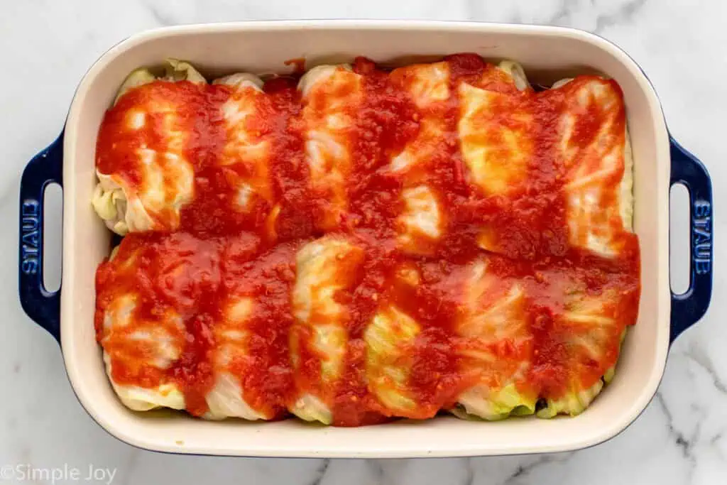 Because this recipe bakes for so long and has a decent amount of prep time, this is a great recipe to make head. Put everything together and get to the point of putting them in the oven. Then cover the cabbage rolls and refrigerate for up to 24 hours before baking.