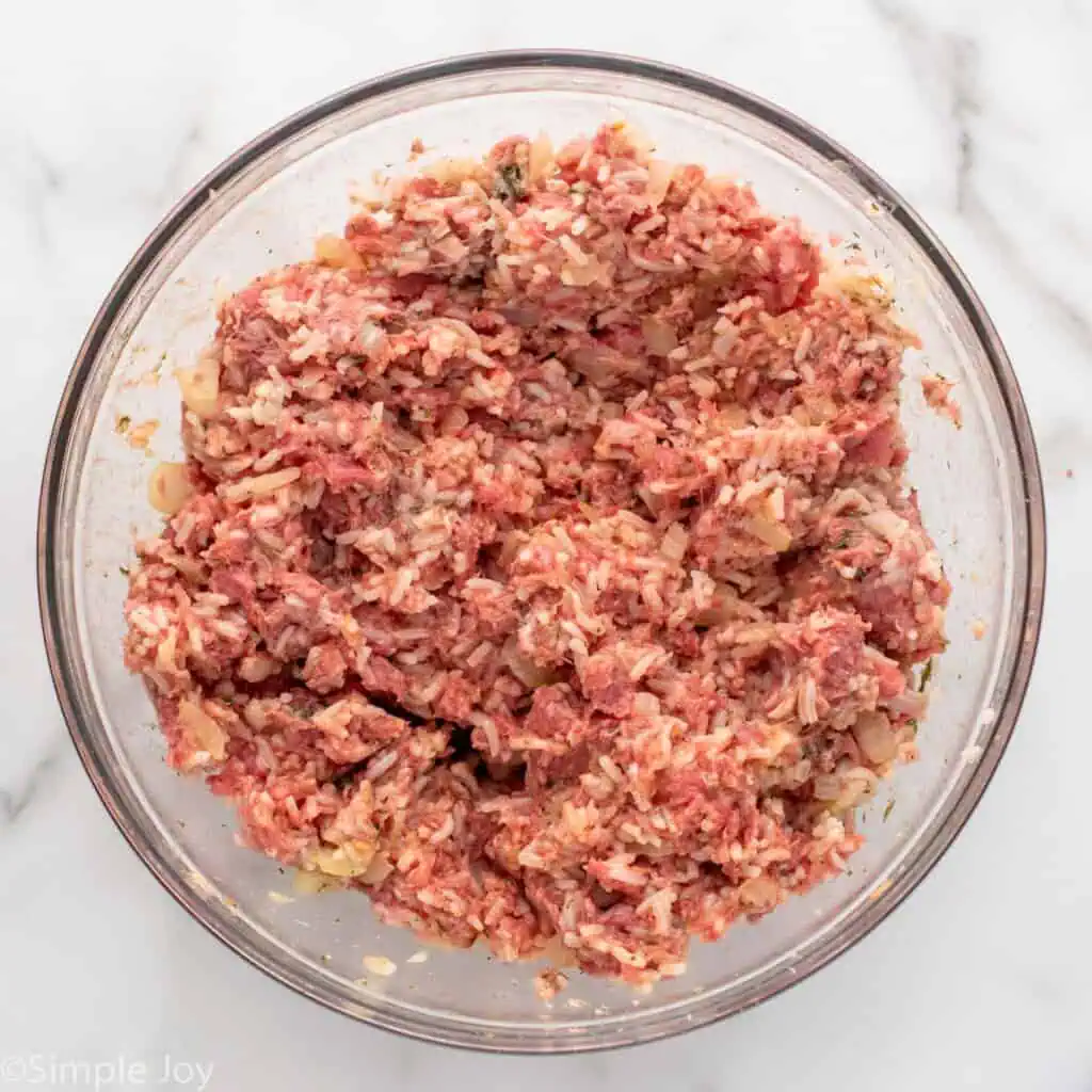 - In a large bowl, combine the cooked onion mixture, ground beef, pork, egg, cooked rice, parsley, kosher salt, dry dill, and black pepper. Add in 3 tablespoons of the tomato sauce.1 pound ground beef, 1 large egg, 2 teaspoons dry parsley, 1 1/2 teaspoons kosher salt, 1 teaspoon dry dill, 1/4 teaspoon black pepper, 8 ounces tomato sauce, 1/2 pound ground pork
