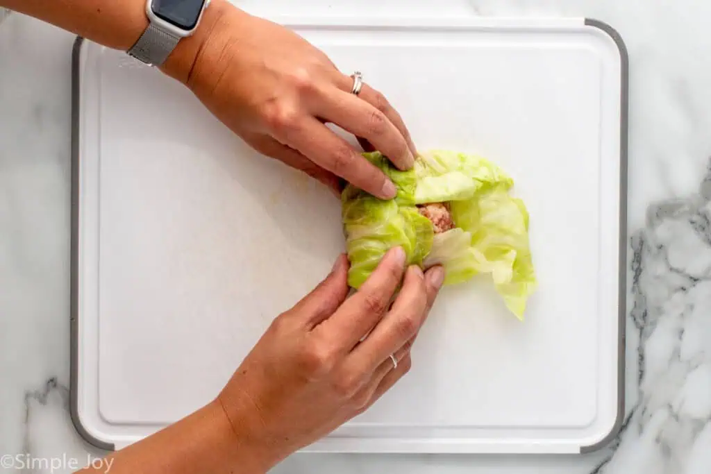 - Working with one cabbage leaf at a time, add about 1/2 cup of the mixture to the middle of the leaf. Fold in the sides and then roll it up like you would roll a burrito. Place it into the prepared baking dish. Repeat with the remaining cabbage leaves.