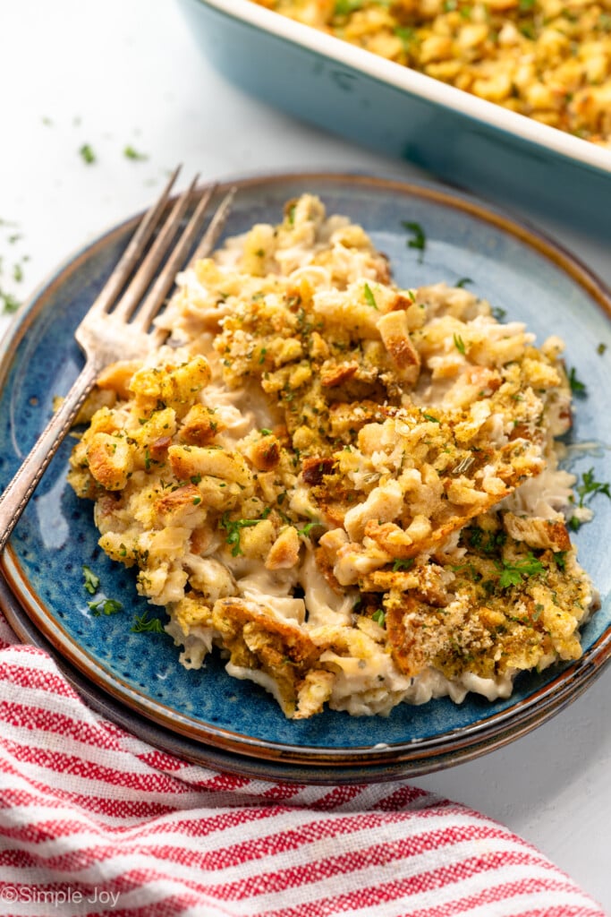 - Chicken: You have a few options for cooked, shredded chicken. The most convenient would be buying a rotisserie chicken from the grocery store or using some frozen cooked chicken. You can make my Instant Pot Chicken, which will give you shredded chicken, hands-free, in 25 minutes, or cook it on the stovetop. Leftover turkey would also be delicious in this stuffing casserole.