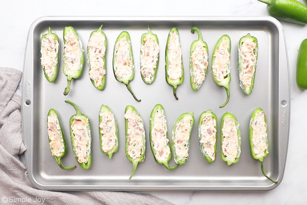 With your gloves still on, fill the jalapeños with the cream cheese filling. Place them on a rimmed baking sheet and bake for 20 to 25 minutes or until the jalapeños are soft and the filling has begun to brown on top.