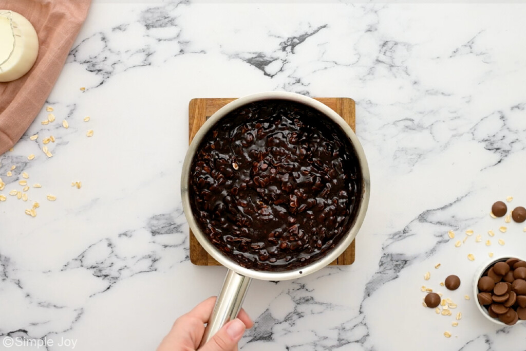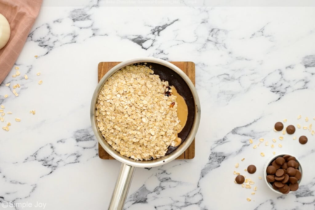 Remove the pan from the heat and stir in the oats, peanut butter, and vanilla, moving somewhat quickly.