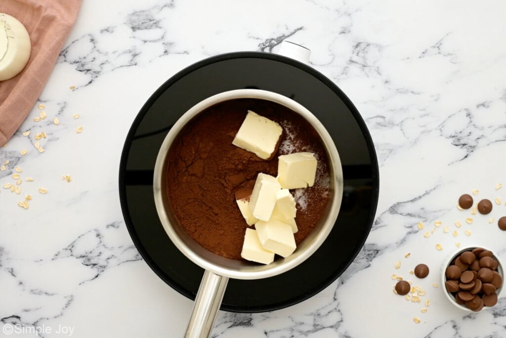 - In a large saucepan over medium heat, combine the granulated sugar, milk, butter, and cocoa powder. Bring to a roaring boil, while stirring consistently.2 cups granulated sugar, 1/2 cup milk, 8 tablespoons butter, 1/2 cup cocoa powder