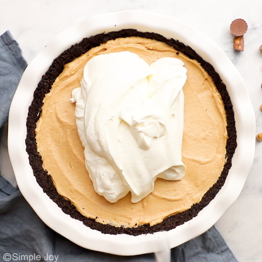 This Peanut Butter Pie is the perfect combination of chocolate and peanut butter. We start with a chocolatey Oreo crust. Then we create the most amazing and delicious creamy peanut butter filling. We top it with whipped cream and finally some chocolate chips, peanut butter chips, and mini Reese’s peanut butter cups.