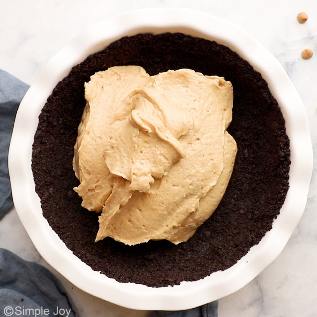 - Pour the peanut butter filling into the chilled Oreo crust. Smooth out the top, and then refrigerate for 8 hours or overnight.