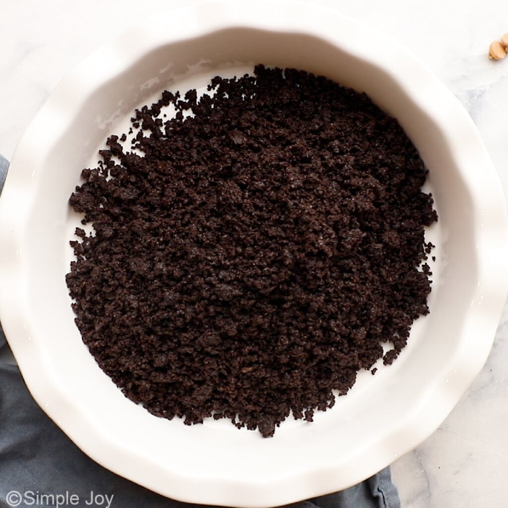 - Crush the Oreos in a blender or food processor. Combine the Oreo crumbs with the melted butter. Press into a 9 inch, deep pie pan and put in the refrigerator while you are making the peanut butter filling.24 Oreos, 4 tablespoons unsalted butter