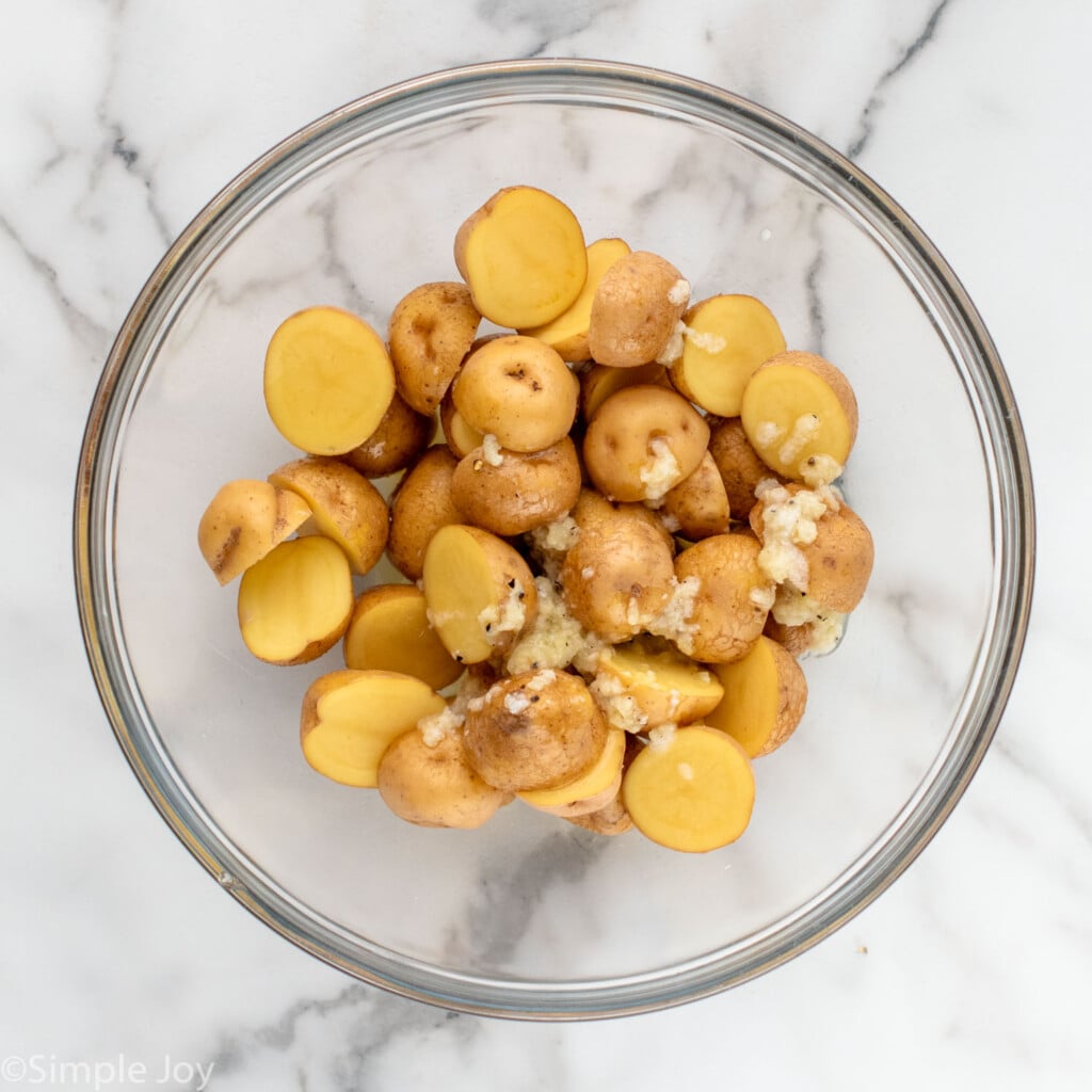 After cleaning and cutting the potatoes, melt the butter and whisk in the garlic. Toss the butter mixture with the potatoes to coat them in a large mixing bowl.