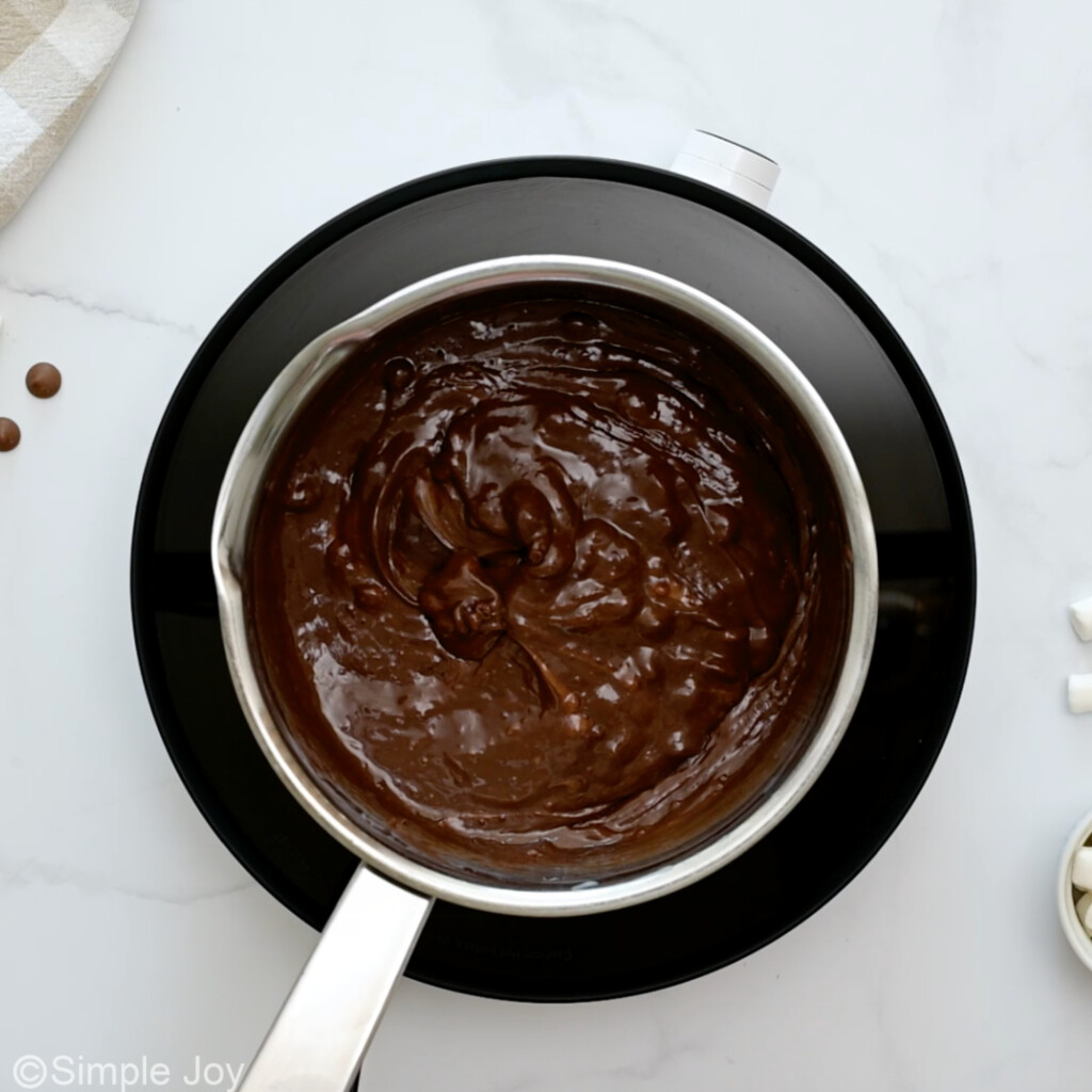 - Continue stirring until the chocolate is fully melted and the mixture is smooth and starts to turn shiny. Stir in the nuts and the marshmallows.1/2 cup chopped walnuts, 1/2 cup mini marshmallows