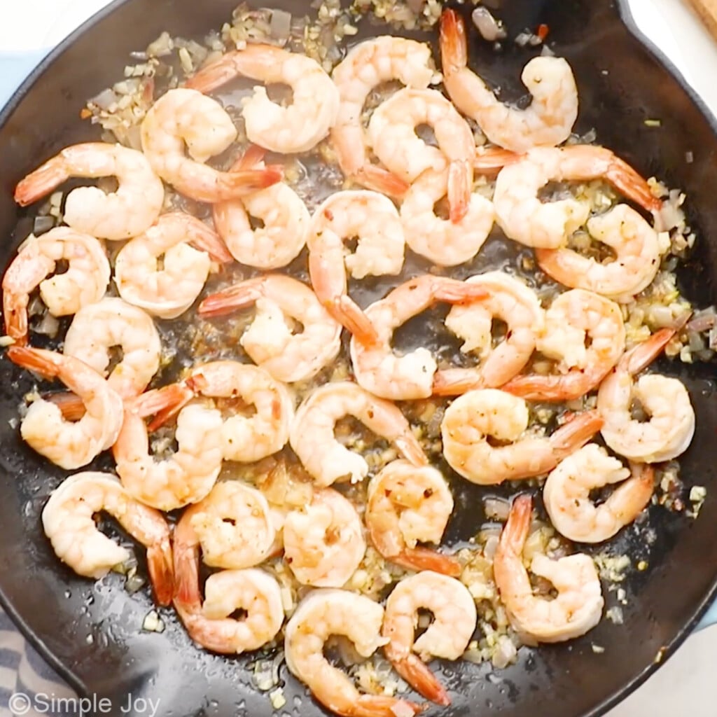 - Season the shrimp with salt and pepper and add to the pan. Cook until they have just turned pink, about 1 to 2 minutes, then flipped and 1 to 2 more minutes on the other side. Be careful not to overcook the shrimp. Transfer the shrimp to a plate and set aside.