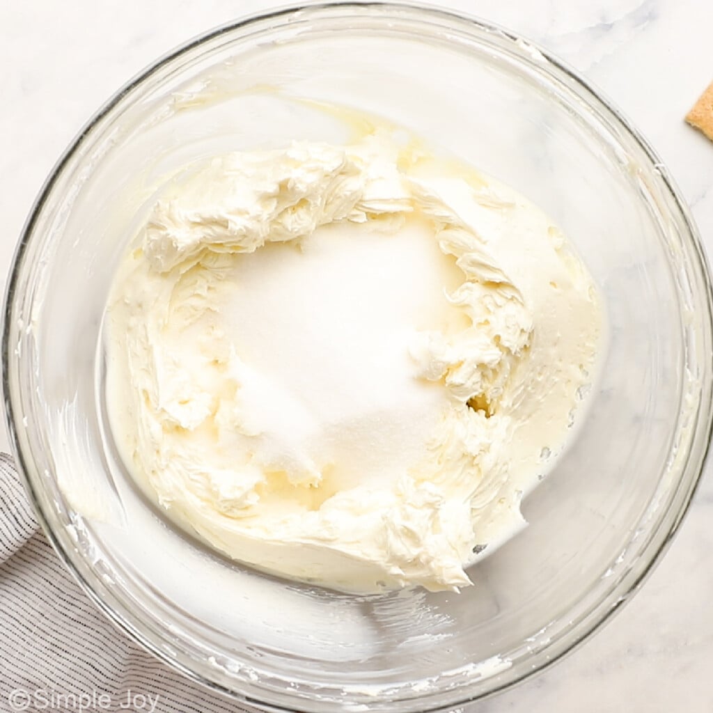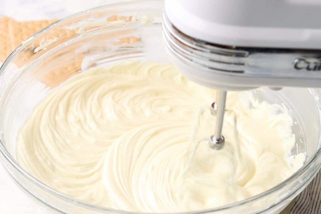 - While the crust is baking, beat the cream cheese in a large mixing bowl with a hand mixer or in the bowl of a stand mixer with the paddle attachment. Beat until smooth, scraping down the sides of the mixing bowl with a rubber spatula as needed.24 ounces cream cheese