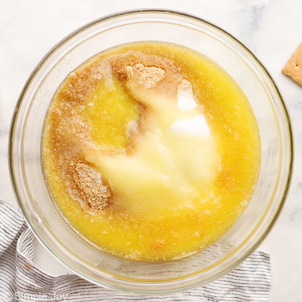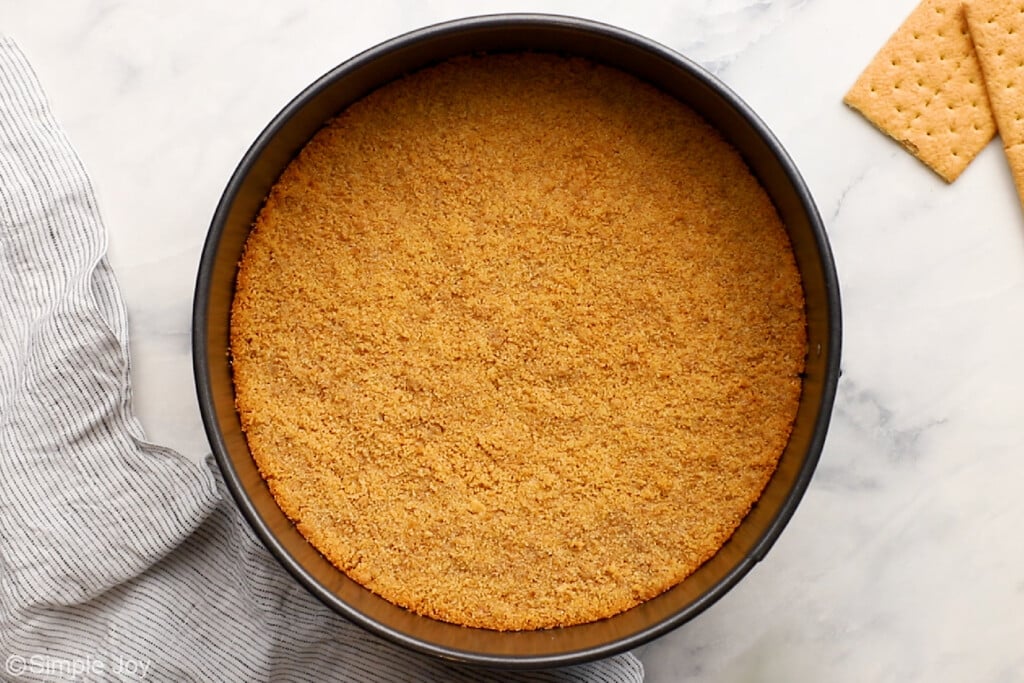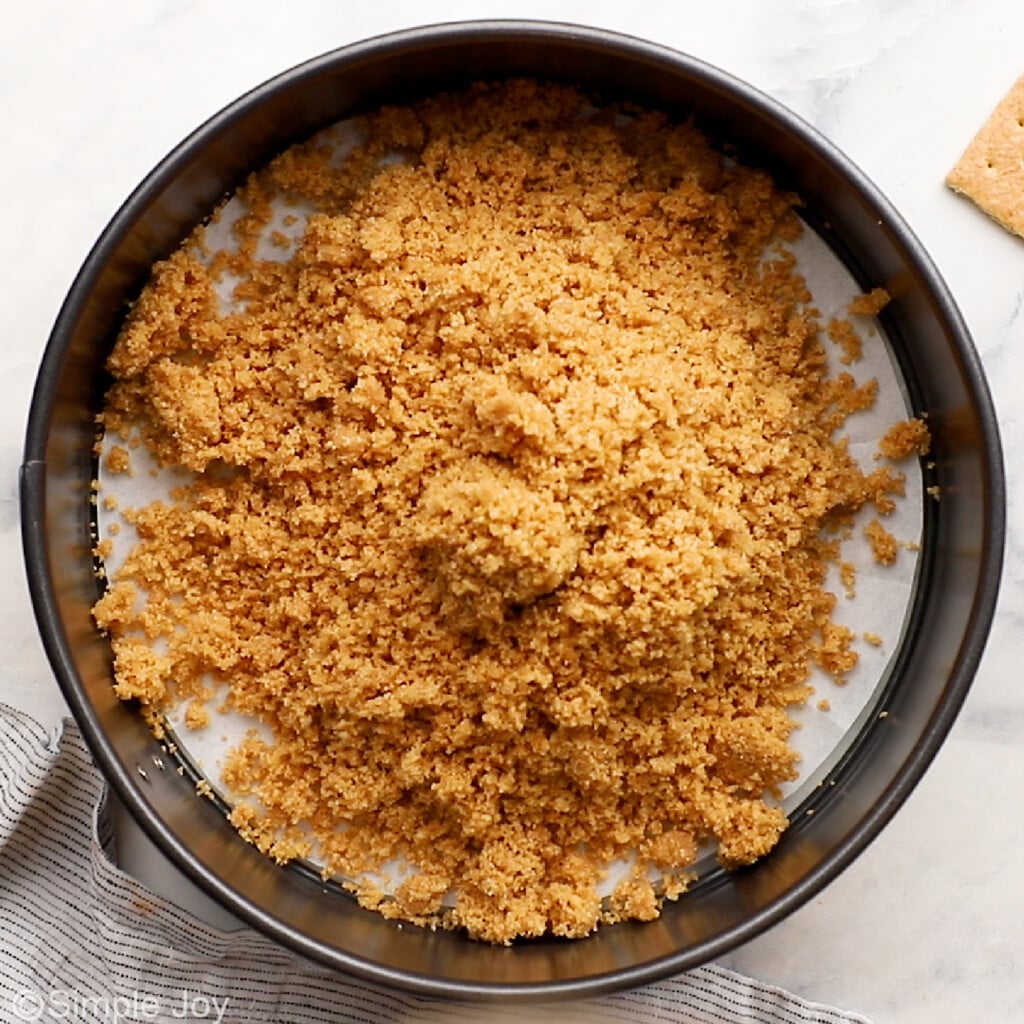 - Combine the graham cracker crumbs, sugar, and butter. It should resemble wet sand. I like to crush the crackers in a food processor and then add the sugar and butter right to that to combine. Press into the bottom of the prepared pan.1 3/4 cups graham cracker crumbs, 1/3 cup granulated sugar, 8 tablespoons unsalted butter