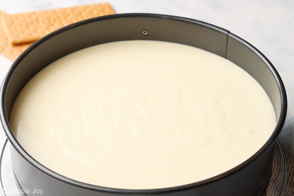 Many homemade cheesecake recipes call for a water bath to prevent the cheesecake from cracking. Part of what makes this the best cheesecake recipe is that we don’t need that step! The following steps prevent the top of your cheesecake from cracking without needing a water bath.