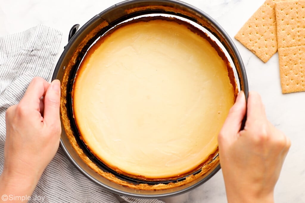 - A shorter baking time: Because this cheesecake is only actively baking for 35 minutes, it can avoid drying out and shrinking, which can lead to cracking.